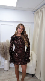 Turn every head in the room with this dazzling sequin mini dress. Designed to shimmer with every step, this piece features a curve-hugging silhouette covered in light-catching sequins for maximum sparkle. The playful feather-trim cuffs add a glamorous, vintage-inspired touch that elevates the entire look.
